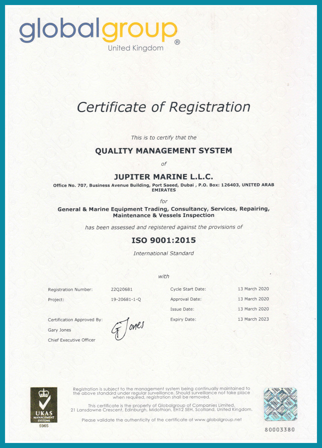 Jupiter Marine is a UKAS accredited ISO 9001:2015 certified company.